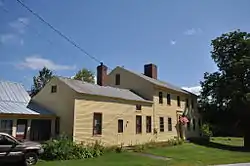 The Andrews House stands close to the east side of South Bridgton Road (Maine State Route 107) in a rural area of southern Bridgton. The house is a rambling connected series of wood-frame structures, with the main house block at the southern end, and ells extending along the road to the north and behind the house to the east. The main block is a 2+12-story structure, five bays wide, with a side gable roof, central chimney, clapboard siding, and a stone foundation. Decorative elements are minimal, with the central entrance framed by pilasters and a fanlight, with a dentillated cornice above. A shed-roof porch extends across the southern facade, supported by fluted Doric columns. A 1+12-story four-bay addition, its front flush with that of the main block, extends north, with another section extending further north to join the house to a carriage barn. On the east side a series of two ells join the house to a livestock barn.[2]