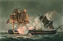 On 5 March 1795 he was promoted to the rank of lieutenant, and appointed to the Sibylle under the command of Captain Edward Cooke.[1] He was first lieutenant of the Sibylle when, on the night of 28 February–1 March 1799, she engaged the French frigate Forte, and succeeded to the command when Cooke was carried below mortally wounded.[1] He conducted the action to a victorious issue, and was immediately afterwards promoted by Vice-admiral Rainier to command the prize.[1] From the East India Company, and from the insurance companies of Calcutta and Madras, he received three swords of honour.[1][2]