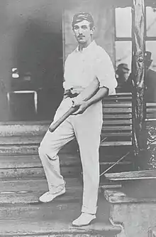 Gwynn, a right-handed batsman, who recorded the highest first class average (56.87) amongst those batsmen who completed ten innings or more during the English season of 1895,[5] enjoyed another remarkably productive season in 1896, plundering over a thousand runs in Trinity flannels, a superlative effort complemented by a haul of 93 wickets at 9.37.[4] Gwynn's irrepressible form reputedly earned him an invitation to represent England against Australia in the second Ashes Test at Old Trafford in July 1896. However, concurrent university examinations rendered Gwynn unable to participate.[6] Instead, English cricket was introduced to the wizardry of K.S. Ranjitsinhji, who took Gwynn's place.[4]