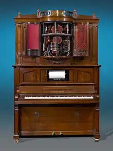 One of the most popular products since 1902 was the self-playing piano Phonola American, the European counterpart of the pianola. Hupfeld had some success with the 1908 reproducing piano DEA, which was later superseded by the more successful Triphonola. The mechanical violin Violina, an orchestrion, despite an ingenious design, was seen as aesthetically unsatisfactory and therefore less successful. Nevertheless by 1930 some 3500 had been built.[2] The instrument contained three violins which could be pressed against a circular bow by a bellows; just one string on each violin played, the note being determined by 'fingers' that were also controlled by bellows. The mechanism was controlled by punched paper rolls, in the same way as the piano section.