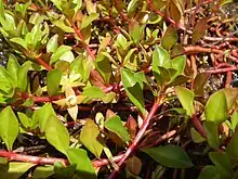Ludwigia repens is a species of flowering plant in the evening primrose family[1] known by the common name creeping primrose-willow. It is native to parts of the Americas and it has the potential to spread easily and become naturalized in many areas. It is known as an aquatic weed in some regions. It is also cultivated as an aquarium plant. This is a mat-forming perennial herb with a creeping stem up to 30 centimeters long, rooting at nodes which come in contact with wet substrate. The leaves are oppositely arranged and up to 4 or 5 centimeters long. The flower has four yellow colored petals no more than 3 millimeters long nested on a base of four pointed sepals which may be slightly longer.