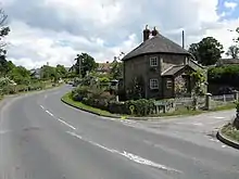 The A438 road entering the western end of the village, with Tidnor Lane to the right.