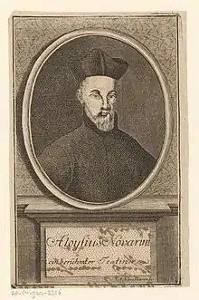 Luigi Novarini was born at Verona in 1594. He received at baptism the name of Girolamo, which he changed to that of Luigi when he took, in 1612, the garb of the Theatines. After having studied theology and entered the priesthood at Venice, he returned to his native city, where he occupied different positions in his order. He was well skilled in the Greek, Hebrew, and Syriac languages, and enjoyed the esteem of the princes and learned men of his time.[1] He died at Verona in 1650.[2] Of his value as a writer, Nicéron says: "His natural vivacity would not allow him to polish his productions; he placed indiscriminately upon paper all that he found in his collections upon the subject of which he was treating, whether good or bad; the desire of using all he had gathered often caused him to make digressions, which only served to swell his books. He also thought more of making large and numerous works than of composing good ones."