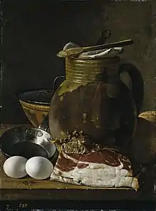 Meléndez painted his still lifes with a serious sense of reverence. What attracted him was not grand themes but the ordinary stuff of everyday life, which he studied with an enormous visual interest in the everyday normality of form. Each still-life painting by Meléndez is visually arresting and compelling and reveals a wonderful technical skill at constructing compositions. Meléndez conveyed the solidity and precise texture of objects in artful compositions of great sophistication. He employed a low vantage point and close-up view of objects placed on a tabletop to give his forms an unprecedented monumentality. The use of strong lighting to bring out the volume of the objects enhanced his extraordinary descriptive skill.