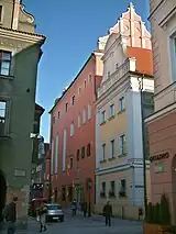The establishment was intended for girls of both German and Polish cultural background; some key documents, e.g. the rulebooks, were bilingual, though general instruction was in German.[7] The schooling was divided into 4 stages, each lasting 2 years. Lowest admission age was 7; when completing education, the girls used to be 15–17. The curriculum was designed very broadly, with 4 hours of Polish language weekly; evaluation was based on a 5-scale mark.[8] Initially Luisenschule admitted 100-150 girls.[9] Quality of education was so high that provincial authorities considered it too resemblant of that offered to males, and demanded it gets lowered.[10] Theoretically the school was opened only to Christians and offered both Protestant and Catholic religious instruction;[11] the headmaster was a Lutheran minister, Johan Gottlob Friedrich.[12] Official supervision was provided by Provinzialschulkollegium, a provincial schooling board.[13] At the very beginning Luisenschule was hosted in a building owned by a local court official Brückner and located at Breslauerstrasse.[14] As it soon proved insufficient, in late 1830 the school moved to a rented building at the intersection of Breitestrasse and Judenstrasse, at a corner of the Market Square.[15]