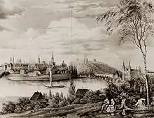 Once Luisenstiftung found itself in financial dire straits in the mid-1830s it was rescued by a thousand-thaler donation of princess Louise.[16] It was again the princess who approached the new duke-governor, Eduard von Flotwell, and made sure that premises taken over from the freshly secularized Benedictine order were granted to the foundation;[17] in 1836 Luisenschule moved into the Gorka-Palace at Wasserstrasse, at that time at another corner of the Market Square. The foundation board carried out major refurbishment works, currently criticized by historians; of little value in terms of adopting the building for educational purposes, the works did away with historical architectural legacy and produced heavy financial burden for the Luisenstiftung balance sheet.[18] However, the Radziwiłł family kept supporting the foundation until the couple left Posen in 1836.[19]