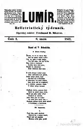 Lumír is a weekly literary magazine that was established in 1851 by Ferdinand Břetislav Mikovec. It was the focal point of the neo-romantic nationalist poet Jaroslav Vrchlický and his Ossianic followers.[1][2] Lumír is the name of a bard in Czech legend.