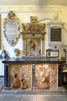 Inside the chapel are alabaster and marble monuments to John Lumley and his two wives, Lady Jane Fitzalan and Elizabeth Darcy.[5] Lady Jane died in 1578; her tomb is decorated with family coats of arms and depictions of Jane's three children at prayer in the chapel of Nonsuch Palace. John Lumley died in 1609; his tomb is also decorated with heraldry. Elizabeth Darcy died in 1617.[4] Her recumbent effigy lies on the tomb.[8] Detailed preparatory coloured drawings of the three monuments, made in about 1590, appear in Lumley's Red Velvet Book.[6][7]
