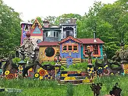 Luna Parc comprises multiple buildings[3][10] and outdoor art pieces[11][12][13] set in an 8.5-acre[14][15] densely-wooded landscape.[2] These structures are built from metal, clay, glass,[2][16] wood, rock,[6] ceramic, cement,[17][18] and ferro-cement.[19] They are designed in a whimsical[3][15][16][20][21] architectural style, featuring vivid colors,[2][3][11][22] curving surfaces,[5][11] detailed mosaic tiling,[4][5][11] and incorporating unusual objects such as bowling balls[9][23] and license plates.[23][24]