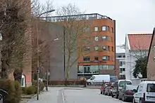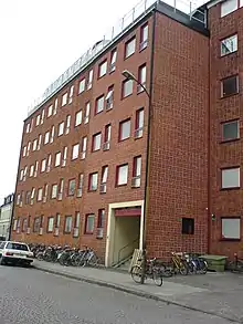 Nationshuset ("The Nation House") was inaugurated in 1959 and is composed of Gamla Huset and Nya Huset ("the Old House" and "the New House", respectively). Its expansion, Nya Huset was built in 1967. The building houses Lunds' headquarters and main housing estate. It is located on Agahrdsgatan, on the southwestern corner of the enclosed block between the Botanical Garden and Stora Tomegatan. Together with 140 apartments, Lunds headquarters and basement is located in the building, the latter of which is the place where most of the nation's social activities take place.[3] The building has a spacious courtyard in which a new housing development will be constructed by 2023. The new development is thus far unnamed but is planned to be a four-story building composed of 14 shared apartments and two one-room apartments. It will be attached with Nya Huset which in turn will also be expanded with additional dorm rooms in what is today its attic.[4][5]
