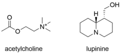 Lupinine is a quinolizidine alkaloid present in the genus Lupinus (colloquially referred to as lupins) of the flowering plant family Fabaceae.[1] The scientific literature contains many reports on the isolation and synthesis of this compound as well as a vast number of studies on its biosynthesis from its natural precursor, lysine.[2][3] Studies have shown that lupinine hydrochloride is a mildly toxic acetylcholinesterase inhibitor and that lupinine has an inhibitory effect on acetylcholine receptors.[4][5] The characteristically bitter taste of lupin beans, which come from the seeds of Lupinus plants, is attributable to the quinolizidine alkaloids which they contain, rendering them unsuitable for human and animal consumption unless handled properly.[6][7] However, because lupin beans have potential nutritional value due to their high protein content,[8] efforts have been made to reduce their alkaloid content through the development of "sweet" varieties of Lupinus.[9][10]
