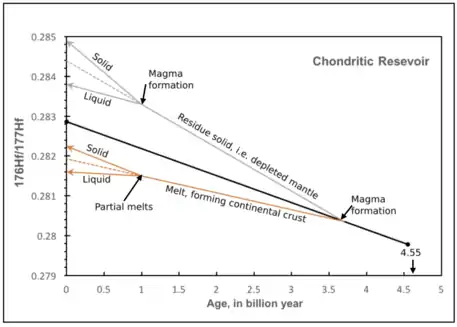 The chondritic uniform reservoir model age is the age at which the material, from which rock and mineral forms, leaves the chondritic uniform reservoir, i.e. the mantle, when assuming the silicate earth retained chemical signature of chondritic uniform reservoir.[4] As described in previous section, melting will cause a fractionation of Lu and Hf in the melt and residue solid, thus resulting in Lu/Hf and Hf/Hf values deviating from chondritic uniform reservoir values.[3] The time or age at which the Lu/Hf and Hf/Hf values from the sample and chondritic uniform reservoir matches is the chondritic uniform reservoir model age.[3][4]