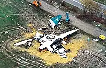 The aircraft slammed onto terrain with its belly, crossing the Route Nationale 1 and scraped the road with its left wing. It then struck an embankment, inflicting major damage to the airframe. The aircraft bounced and both wheels and blades came off of the aircraft. The empennage and part of the right wing broke away. The aft fuselage detached and rested on its right side. The aircraft eventually came to a halt 25 metres (82 ft; 27 yd) further away. After coming to a stop, a fire began to erupt on the central portion of the crushed fuselage.[6]: 22–24
