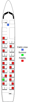 Most of the passengers were business officials from Germany.[11] Seventeen were found dead at the crash site with five survivors, three of whom died in the hospital. By nightfall, 18 bodies out of the 20 dead were found, while the other two remained missing. The bodies were thought to be buried under the smoldering fuselage. Rescue workers were using a crane to disentangle the charred remains.[11] Amongst the passengers killed on the flight was artist Michel Majerus.[13]