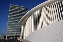 The Salle de Musique de Chambre, the ticket office and access to the underground car park are not within the main building, but are next to it outside within two aluminium-covered shells which lean against the filter of columns.