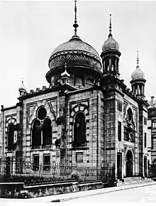 In 1894 a new synagogue was built at the corner of Rue Notre-Dame and Rue Aldringen.[3] It was designed by German architects Ludwig Levy and Charles Arendt who also oversaw construction. The synagogue was built in a Moorish Revival style similar to the Great Synagogue of Florence. It had room for 300 people: 150 for male worshippers, 120 for female worshippers and 30 seats for the chorus and schoolchildren. It was opened on September 28, 1894 by Chief Rabbi Isaac Blumenstein and members of the government and communal council.[4] In May 1941, the synagogue was desecrated by the Gestapo and was progressively demolished until 1943, when it became difficult to find a company willing to do the work.[5][4]