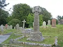 Arthur Langdon (1896) recorded three Cornish crosses and one cross base in the parish. One cross is in the churchyard (illustrated above right); it was brought there in the 19th century from Three Stiles near Consence. Another cross is at Methrose and the third at Trevellan (lying horizontally and built into a hedge). The cross base is at Trevellan Lane End.[8] Andrew Langdon (1994) does not mention the cross at Methrose. Trevellan Cross was removed from the hedge and erected at Lockengate in 1903; in 1972 it was moved a few yards to the crossroads on the A391.[9]