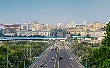 Luzhniki Metro Bridge (Russian: Лужнецкий метромост), also known as Metromost (Метромост), is a concrete double-decked (two-level) arch bridge carrying a road and a Moscow Metro line across the Moskva River in Moscow, Russia. It connects the neighbourhood of Luzhniki Stadium to Sparrow Hills. The bridge houses Vorobyovy Gory, the only station of Moscow Metro located over water. Designed in 1958 by V.G. Andreyev and N.N. Rudomasin (structural engineering), the bridge rapidly decayed and was rebuilt in 1997–2002.