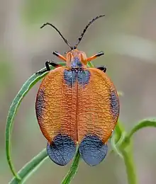 Lycus trabeatus, common name tailed net-winged beetle, is a species of beetle in the family Lycidae, which is native to the eastern, southern Afrotropics and Arabian Peninsula. They are diurnal, aposematic insects. Adults feed on various flowers and their nectar, while larvae live under tree bark, in dead wood, or in detritus where they may live on fungi.[2]
