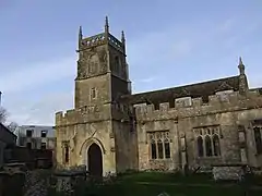 A church at Lydiard Tregoze was mentioned in 1100.[2] The present St Mary's parish church stands next to Lydiard House and is built in limestone rubble with some ashlar. The nave and north aisle are from the 13th century, while the chancel, south aisle with porch, and tower are of the 15th. A painted triptych was begun in 1615, its outer panels showing the St John family tree;[10] the south chancel chapel was rebuilt for the family in 1633. The plastered nave walls carry paintings, some from the 13th century. Windows have reset medieval glass, and the west window of 1859 is by Alexander Gibbs. A canopied monument to Sir John St John and his wives, c. 1635, is within railings.[11]