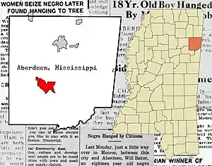 Between Okolona and Aberdeen, Mississippi, 18-year-old farmhand William Baker was putting a buggy into its shed when the six-year-old daughter of Constable Sidney Johnson got into it. Baker allegedly then took the girl to a shed where she started screaming. Her mother came running and grabbed hold of him. A white mob quickly gathered and hanged Baker.[2] His body was discovered by Sheriff Lewis hanging from a Chinaberry tree.[3] The Chicago Whip writes the lynching took place 10 miles (16 km) from Aberdeen, Mississippi.[4]