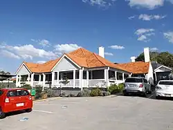 The roof is steeply pitched and composed of two large hips that are symmetrically arranged around a central axis through the front elevation and are clad in terracotta Marseilles pattern tiles. Twin gables, of a uniform roof pitch, project from the building's front elevation. The pediments of the gables are clad with fibrous cement sheeting and are decorated with wide timber battens. Two tall rendered chimneys with concrete caps are the only other visible elements on the vast roof. Part of the verandah roof on the eastern side of the house has been replaced with corrugated iron.[1]