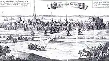Lyngby Kongevej was the first of a number of royal roads created by Frederick II and his successor Christian IV.[1] The royal roads were reserved for the king and his men, including the royal mail coaches and couriers. The roads were protected by locked boom gates. Unauthorized use of the roads was originally sanctioned with confiscation of horses, carriage and load and later with half a year of forced labour at Bremerholm or Spindehuset. Remains of the original road can still be seen in Rude Skov and Geels Skov.