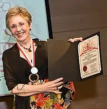 ![]() Johnston at her induction into The Giants of the North: the Canadian Cartoonists Hall of Fame in August 2008 | |