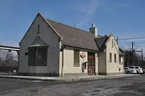 Lyons station was originally built in 1931 by Delaware, Lackawanna and Western Railroad to coincide with electrification and to serve the Lyons VA Medical Center, which opened in 1930. It was the last station built by the Delaware, Lackawanna, and Western Railroad in New Jersey and the second-to-last station depot built overall by the DL&W, behind the station at Syracuse, New York in 1941.[4] The single station building, on the north side of the single track, is a Tudor Revival and Mission Revival style structure. Designed by Delaware Lackawanna and Western Railroad architect D.T. Mack or one of his staff, it is of brick and stucco construction and has limestone trim with carved rosette ornamentation at the gable ends. The station depot also features freight doors on the right side. A brass ornamental arch stands on the westernmost part of the platform.[10] The station building was listed in the New Jersey Register of Historic Places on March 17, 1984, and in National Register of Historic Places on June 22, 1984, as part of the Operating Passenger Railroad Stations Thematic Resource.[11][12]