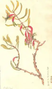 According to Les Hiddins, Aboriginal people would eat the fruit without chewing so they wouldn't stick to the tongue.[30] The ripeness of the berry is indicated not only by its softness, but often also by a slight translucence. When quite ripe the sticky, gelatinous, sweet pulp surrounding the single seed is pleasant to eat, but its great stickiness often make the seed almost impossible to spit out. Birds have the same difficulty and may sometimes be seen wiping their beaks free of seeds against the branch of a tree.[31] Jennifer Isaacs lists berries of L. exocarpi and L.spathulata as being eaten in the Central desert[32] Peter Latz notes that the calories obtained would be rather low. Aborigines often pluck whole branches from the tree and pick off the berries at their leisure. These berries are particularly favored by children. Although all Aboriginal groups have two or more names for mistletoes, it appears that they do not give separate names to each species. The Walpiri word for both L. murrayi and L. spathulata is pawurlirri.[33] The Antakirinja people around Coober Pedy call the berries of L. exocarpi Ngantja.[34] Reference to the fruit was first contained in a letter written by Governor Gawler during an ill-fated expedition in 1839 led by Charles Sturt. Gawler to his brother-in-law, Henry Cox, 20 December 1839: "The poor boy (Henry Bryan) accompanied me most cheerfully, he had been resting all day and did not appear to suffer from the subsequent exertion. He brought me the pulpy but bitter fruit of the mesembryantheumum and the little berries of the exocarpi - and ate plenty of them himself - he made many observations about our course, appearing to recollect its striking features well, and calculated our distances with much precision".[35]