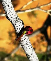 At least 27 species of Australian butterflies use mistletoes as their host plant. The two groups are the jezebels (Pieridae) and azures (Lycaenidae). Upon hatching, the caterpillars subsist and grow entirely on the foliage. Although some species drop off to pupate in the ground beneath, most remain in the clump attaching their chrysalis to the tips of denuded twigs or burrowing into the junction between mistletoe and the host tree to evade predators. L. exocarpi is a host plant for Ogyris aenone[27] and is a popular food plant for nectar feeding birds when in full flower.[28]