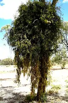 In New South Wales the most common hosts are species of Eucalyptus and Acacia and also Flindersia, Pittosporum, Santalum[24] In a comprehensive study of Australian herbaria specimens, Paul Downey found that the host plants for Australian mistletoes were mostly dicotyledonous angiosperms with a small number of gymnosperms in the genera Araucaria, Callitris and Pinus. No host species were herbaceous. Every host family and genus recorded contained species which were not documented as mistletoe host species. The two major genera of host species were Eucalyptus and Acacia with 2084, and 2559 records respectively. There were 187 species of Eucalyptus and 150 species of Acacia. Seven mistletoe species commonly parasitised exotic host species including L. exocarpi. The commonly recorded exotic host species included Nerium oleander, Citrus spp., Prunus spp., Schinus molle and Quercus spp. L. exocarpi was found in 901 records and 109 species. The host families were Apocynaceae, Caesalpiniaceae, Capparaceae, Casuarinaceae, Chenopodiaceae, Fabaceae, Fagaceae, Loranthaceae, Malvaceae, Meliaceae, Mimosaceae, Moraceae, Myoporaceae, Myrtaceae, Oleaceae, Pittosporaceae, Polygonaceae, Proteaceae, Rhamnaceae, Rutaceae, Santalaceae, Sapindaceae, Solanaceae and Zygophyllaceae.[23] In a 1990 study of L. exocarpi subsp. exocarpi in Southern South Australia, Yan found that this species showed a specific preference for Alectryon oleifolius and Myoporum platycarpum supporting Barlow's view that all Australian mistletoes of open forest and woodland are host specific to some extent. He also found that rainfall was a determining factor in regulating the distribution.[25]