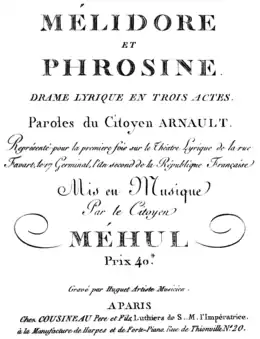 Arnault derived his libretto from Gentil-Bernard's narrative poem Phrosine et Mélidore. In his memoirs, he describes the trouble he had with the French Revolutionary censorship of the time. He submitted the libretto to the censor Jean-Baptiste Baudrais, who found "nothing innocent in it." Baudrais explained: "It's not enough...that a work is not against us, it must be for us. The spirit of your opera is not republican; the behaviour of your characters is not republican; the word 'liberty!' is not pronounced a single time. You must bring your opera in harmony with our institutions."[1] Fortunately for Arnault, he was able to enlist the help of the writer Legouvé who added a few more lines to the libretto, containing enough references to liberty to satisfy Baudrais.