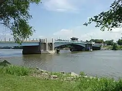 Running immediately next to the river, M-13 meets I-75/US 23 at that freeway's exit 153 just southeast of the Zilwaukee Bridge. The highway runs along Bay City Road as it continues to follow the Saginaw River through the Crow Island State Game Area. On the south side of Bay City, the name changes to River Road. M-13 passes the James Clements Municipal Airport and transitions to follow Broadway Street into downtown. At Lafayette Street, M-13 turns west and merges with M-84. The two highways run concurrently across the Saginaw River on the Lafayette Avenue Bridge. The structure's two spans connect the riverbanks with the Middle Ground Island in the center. West of the bridge, M-13/M-84 follows Salzburg Avenue to the intersection with Euclid Avenue. At that location, M-13 turns north along Euclid Avenue, which runs along the western city line. M-13 meets the 2 one-way streets that carry M-25 and the I-75 business spur at the intersections with Thomas and Jenny streets. From this intersection on, M-13 forms a part of the Lake Huron Circle Tour. Farther north, the highway turns northwesterly on Huron Road; Euclid Avenue continues north as M-247.[3][4]