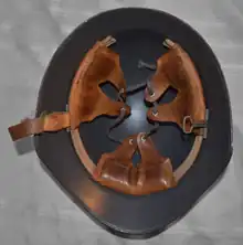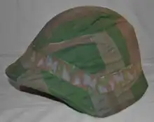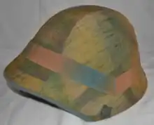 In 1940 a version of the M18 was made but with a shallower skirt and in 1943 most M18s and M18/40s were given a coat of matte black paint mixed with sawdust for a textured finish, as well as a new liner that only went around three-quarters of the circumference of the inside of the shell designated M18/43. New production helmets after this year having more shallow side skirts to its former model. The M1931 camouflage covers for the helmet were introduced in 1943; reversible from one of two patterns depending on the conditions.[3] A second type of camouflage cover was adopted in 1956 featuring a variant of the Swiss TAZ 57 pattern. The earlier M18 was exported to Argentina in the late 1930s and issued - as the M1938 - as its first combat steel helmet.[4] It was also used as a civil defense helmet painted a fluorescent yellow.
