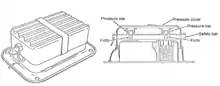 The M1936 (Mle1936) is a French light anti-tank mine used during the Second World War. The mine was captured in large numbers by the German army after the Fall of France, and was later used in the Atlantikwall, North Africa and Italy. The mine consists of a base plate on top of which is a rectangular steel box containing an explosive charge. On top of the container are two M1935 or M1936 pressure fuzes. A pressure cover is fixed on top of the container by wires attached at either end of the container. Two pressure bars are welded to the inside of the pressure cover, each one is directly over a fuzehowever, each bar has a recess preventing it from pressing on the pressure fuze, until a safety bar is inserted. The safety bar covers the recesses allowing the pressure cover to bear down directly on the pressure fuzes.