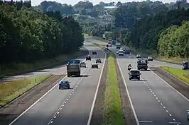 The motorway starts shortly after junction 7 of the M2 Northwards at the split in the carriageways on the M2 around 1 mile from junction 1 of the M22, where the M2 was to head north towards Ballymena.[3] After meeting junction 1 – the site of the Junction One retail outlet – it continues west across Ferguson's Water, the Belfast-Derry railway line and Mill Burn as it bypasses the suburbs of Antrim to the north. Between junctions 2 and 3 it passes between Randalstown and the Randalstown forest, crosses the River Main, and then ends at junction 3. The M22 is a two-lane dual carriageway throughout its length.