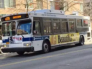 The Manhattan and Bronx Surface Transit Operating Authority began operating a bus route on September 10, 1962, designated as the M107, on a six-month trial basis. Bus service ran every 15 minutes between 6:30 a.m. and 10:30 p.m. from Monday through Saturday, and 30 minutes during these hours on Sundays and holidays. It originally ran from 106th Street and the FDR Drive to 110th Street and Riverside Drive.[2] In the 1963 fiscal year, this route was extended at the request of residents along the route.[3] On May 24, 1964, it was truncated to run solely on 106th Street between 5th Avenue and FDR Drive.[4] The M107 became a branch of the M19 on January 7, 1974, and in May of 1993, the main branch of the M19 was relabeled to the M96, and three years later, in 1996, the 106th Street branch of the M96 was relabeled to the M106, and on this same date, it was rerouted to use Fifth and Madison Avenues between 96th/97th Streets and 106th Street instead of Lexington and Third Avenues.