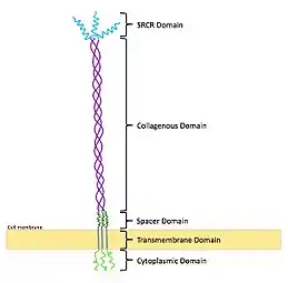 MARCO is a transmembrane protein that has 5 domains (see figure).[10] The domain within the cell is called the cytoplasmic domain, as well as a transmembrane domain.[10] The extracellular regions of MARCO include a spacer domain, a collagenous domain, and the SRCR domain. The SRCR domain is required for MARCO binding to ligands, via 2 highly conserved arginine residues, termed the RxR motif.[10][12]