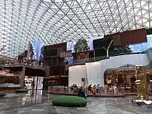 Designed by Kohn Pedersen Fox Associates, it was constructed at a cost of $3.4 billion.[6][7] The unique structure has the appearance of nine jewel-like boxes stacked upon each other, forming two interconnected towers. Its exterior is coloured gold, silver, and bronze similar to the MGM Macau. In 2018, the hotel won the Emporis Skyscraper Award.[6] MGM Cotai, with a total floor area of 280,000 sqm, has 1,390 rooms and suites including 16 skylofts and 27 mansion villas.[2] The hotel's atrium connecting the main lobby to shops and restaurants, named The Spectacle, features the world's largest free-span gridshell glazed roof that is self-supporting.[8] 125 gaming tables have been allocated to the property's casino, of which 100 were allocated at launch and the remaining 25 to be allocated in 2019. A further 77 tables transferred from MGM Macau have been authorised by the government, bringing the total to 177 gaming tables.[1]