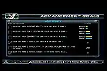 One of the game's main gameplay modes is "Road to the Show" mode. In Road to the Show, the player creates a player to be part of an organization. The player controls only that player through their career, and attempts to make them better by earning skill points from achieving goals such as getting hits, stealing bases, or turning double plays.[5] The career player begins playing in the minor leagues at AA class, and progresses through AAA class until they are called up to the Major Leagues.[5] The player must accomplish goals that are given to them by their team manager, which in turn give then skill points if they are completed, and deduct skill points if they are failed or not attempted.[5] There are also "advancement goals" that the player must accomplish over a certain period of time that will help the player's career player advance to higher levels of play. Advancement goals include developing abilities, getting higher stats, and getting on base more often.[5]