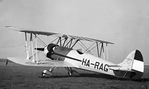 The MSrE M-21 Harag (Hungarian: "Fury") was an aerobatics aircraft built in Hungary in 1936,[1][2] sometimes known as the Szegedy M-21 after one of its designers, József Szegedy. It was a conventional biplane design with single-bay staggered wings of equal span braced by N-struts. The pilot sat in an open cockpit, and the tailwheel undercarriage featured divided main units. Only a single example was built.
