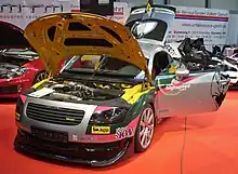 MTM achieved notoriety for its high-speed testing. For its projects the company uses the "Bimoto"-(Twin engine) which is an Audi TT equipped with two 1.8-liter four-cylinder turbocharged engines from Volkswagen. This configuration gives a power of 375 kW (510 hp) from each motor, with a maximum output of 750 kW. The power from the engines is transmitted via two six-speed transmissions to both axles. In 2003 during an Auto Motorund Sport test drive, the "Bimoto" was measured at a speed of 374 km/h, a new record for this publication.[7]