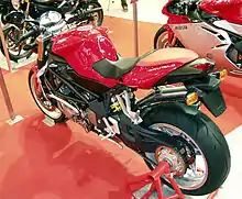 First shown at the 2007 Milan EICMA show, the Brutale 1078 RR won the "Most Beautiful Motorcycle" award.[7] Featuring a 154 bhp (115 kW) version of the 1,078 cc engine from the F4 RR 312, the model was the fastest and top of the range Brutale. Revised 50 mm Marzocchi forks were fitted and racing Brembo monoblock were used. The new forged aluminium five-spoke star-shaped wheels were also from Brembo.[31]