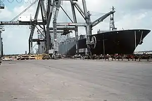 1. "The Military Sealift Command-chartered vehicle cargo ship CAPE HUDSON (T-AKR-5066) lies tied up at the pier during unloading operations. The CAPE HUDSON transported the tanks and other equipment back from the Persian Gulf region, where they were used in Operation Desert Shield and Operation Desert Storm". The U.S. National Archives. 19 July 1991. Retrieved 15 April 2021.