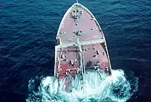 The stern section remained afloat and was towed into Port Hastings, Nova Scotia where the remaining 16,000 tonnes of oil was off-loaded once weather had improved. What remained of Kurdistan was later towed to Europe and retrofitted with a new hull before returning to service as the Simonburn in November of 1979.[12] The severed bow section was towed to deep water south of Sable Island and sunk by gunfire from HMCS Margaree on 1 April, 1979.[11][13][14]