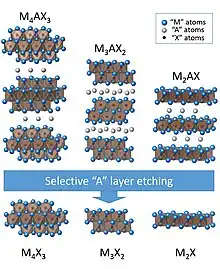 MXenes are typically synthesized by a top-down selective etching process. This synthetic route is scalable, with no loss or change in properties as the batch size is increased.[9][10] Producing a MXene by etching a MAX phase occurs mainly by using strong etching solutions that contain a fluoride ion (F−), such as hydrofluoric acid (HF),[2] ammonium bifluoride (NH4HF2),[11] and a mixture of hydrochloric acid (HCl) and lithium fluoride (LiF).[12] For example, etching of Ti3AlC2 in aqueous HF at room temperature causes the A (Al) atoms to be selectively removed, and the surface of the carbide layers becomes terminated by O, OH, and/or F atoms.[13][14] MXene can also be obtained in Lewis acid molten salts, such as ZnCl2, and a Cl terminal can be realized.[15] The Cl-terminated MXene is structurally stable up to 750 °C.[16] A general Lewis acid molten salt approach was proven viable to etch most of MAX phases members (such as MAX-phase precursors with A elements Si, Zn, and Ga) by some other melts (CdCl2, FeCl2, CoCl2, CuCl2, AgCl, and NiCl2).[17]