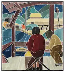 Hewit made prints of city and small-town life from that time. Using the white-line woodblock technique, she created prints of women sunbathing at the beach, The Ball Game (1934), factories, and neighbors with gable-roofed house that reflect her interest in modernism in the slightly abstract forms. Her works reflect influence of 19th-century Japanese ukiyo-e woodblock prints, her study with Lazzell, and French works, like that of Paul Gauguin and Maurice Denis. She said that she liked "block printing because it gives the family of moderate means an opportunity to have something of color and art in their homes."[2]