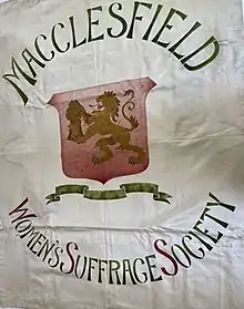 Macclesfield Women's Suffrage Society banner in Macclesfield museums - made in silk in 1911 by The Macclesfield School of Embroidery