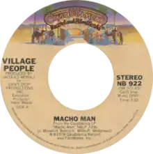 "Macho Man" is a song by American disco group Village People, released as the second single and title song of their eponymous album (1978).[1][2] The song entered the Billboard Hot 100 on June 24, 1978[3] (when the album had already been charting since March[4]) before picking up more airplay that August. It became the Village People's first charting hit in the United States, peaking on the Hot 100 at number 25 on the week of September 2.[5][6][1]